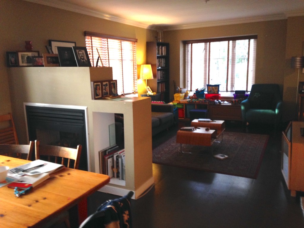 The photo below shows the room before my transformation. The living room/dining room wall were painted a dark colour. The rug was dark, and the fireplace lacked interest.