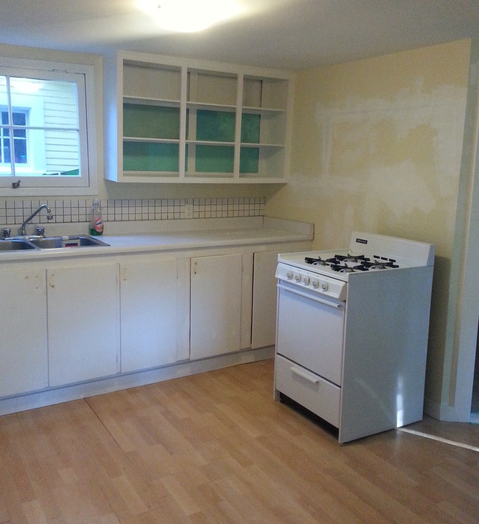 Before (below): The lack of a backsplash, and limited working surface made this dated kitchen drab and nonfunctional