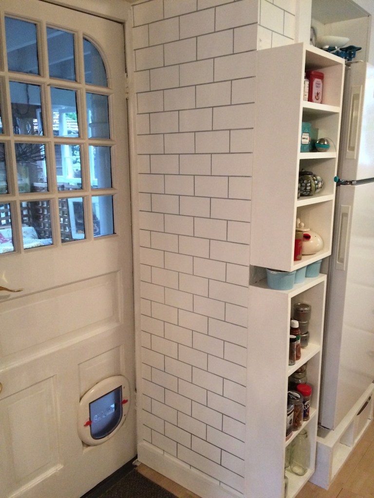 I built shelves beside the fridge which added storage and made it look flush. The subway tiles are actually drawn on the walls over glossy white paint. The room now has interest without the expense and mess of tiling.