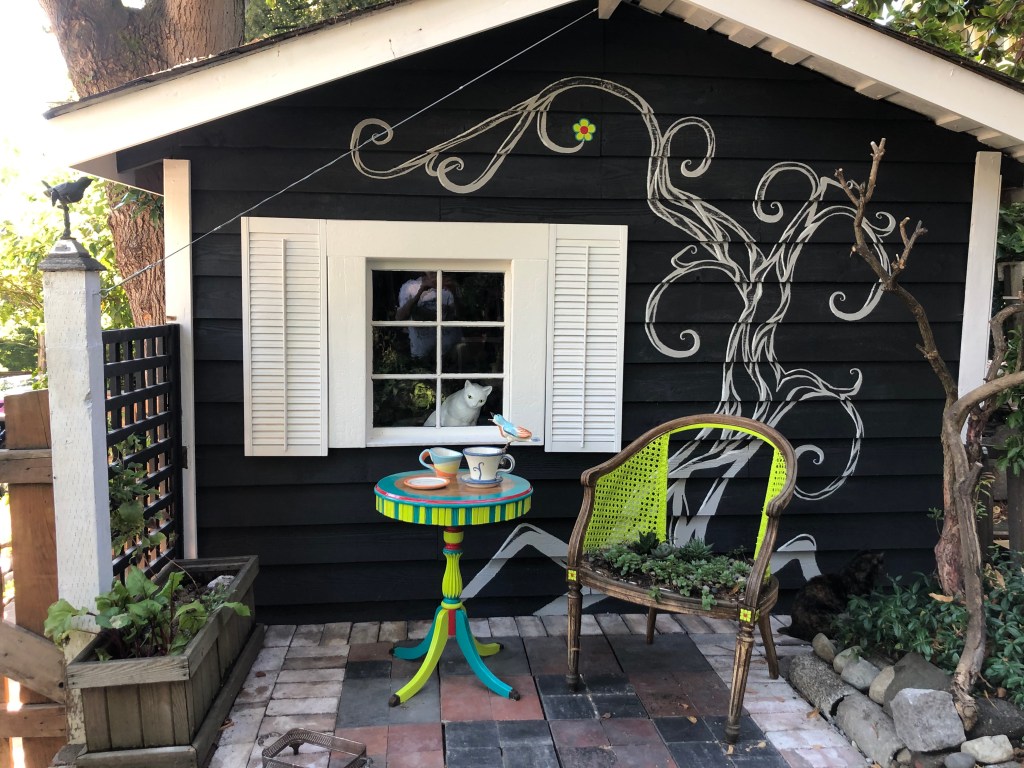 An old shed transformed into a whimsical garden folly
