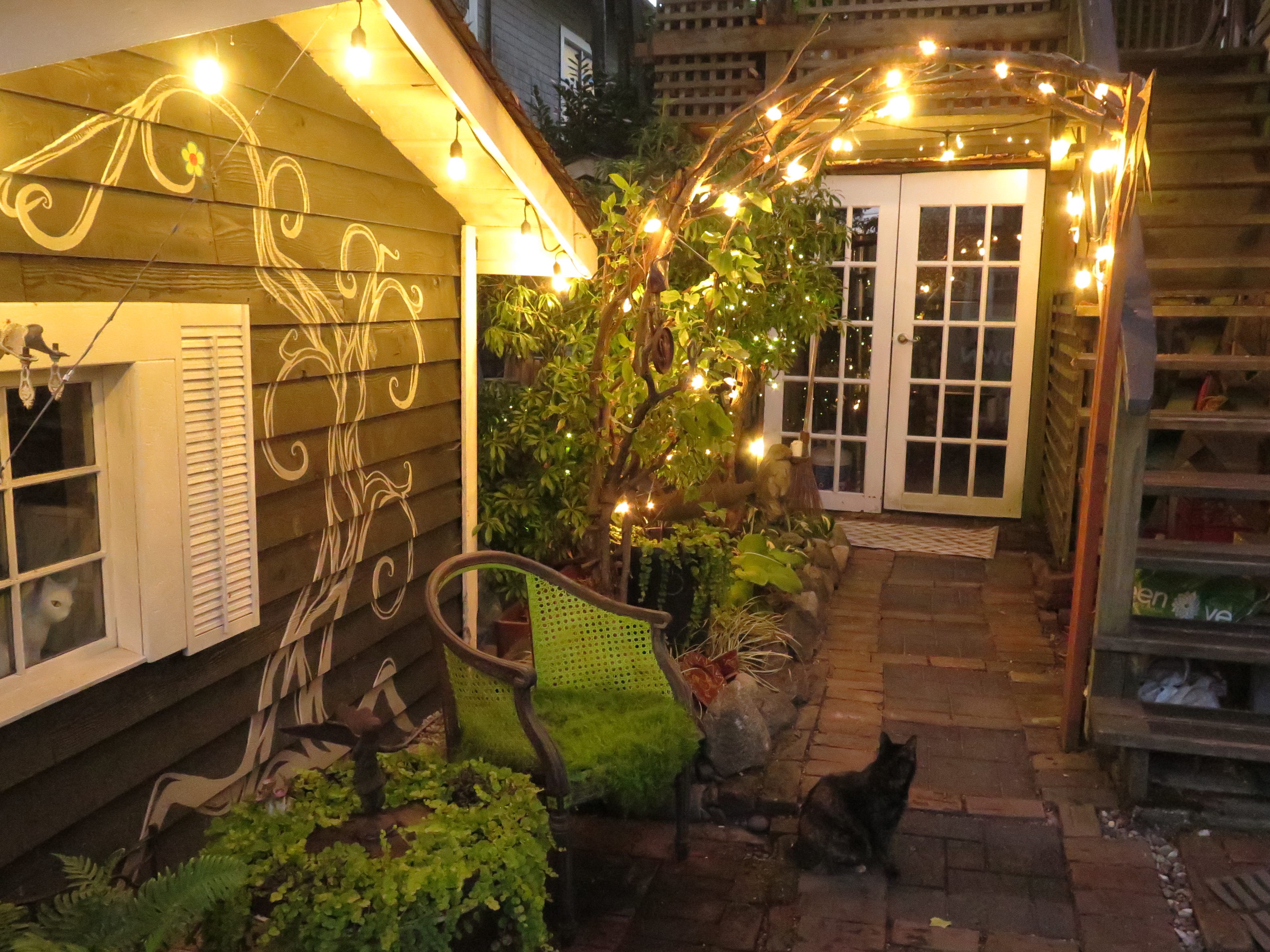 At night, after a bit more magic: the table evolved to become part of the greenery, and a string of lights over the folly and a twisted wood arch invite you into fairyland.